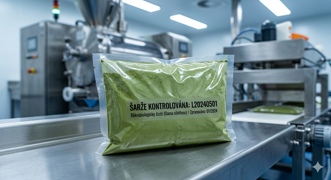 Klíčovým prvkem technologického procesu po sklizni a sušení kratomu je zajištění mikrobiologické stability rostlinného materiálu. Vzhledem k přírodnímu původu suroviny je nezbytné eliminovat riziko výskytu patogenních organismů. Standardem společnosti Plody země je využívání sterilizace pomocí gama záření. Tento proces je vhodný pro dosažení zákonem stanovených mikrobiologických limitů, kdy šarže musí být negativní na přítomnost bakterií rodu Salmonella a vykazovat hodnoty E. coli nižší než 100 CFU/g. Celkový počet mikroorganismů (CPM) nesmí překročit hranici 10^7 CFU/g.